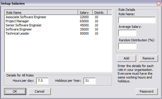 This is as simple as adding developers setting the salaries. If you would prefer to make it difficult for people to guess what money their colleagues are earning, set a random distribution. This lets the software choose a value within this percentage of the real figure. The values for this dialog are automatically saved in a safe place.