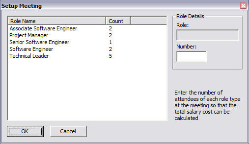 Before each meeting, go to the "Setup Meeting" dialog and choose the number of each type of attendee at the meeting. The values for this dialog are automatically saved in the registry.